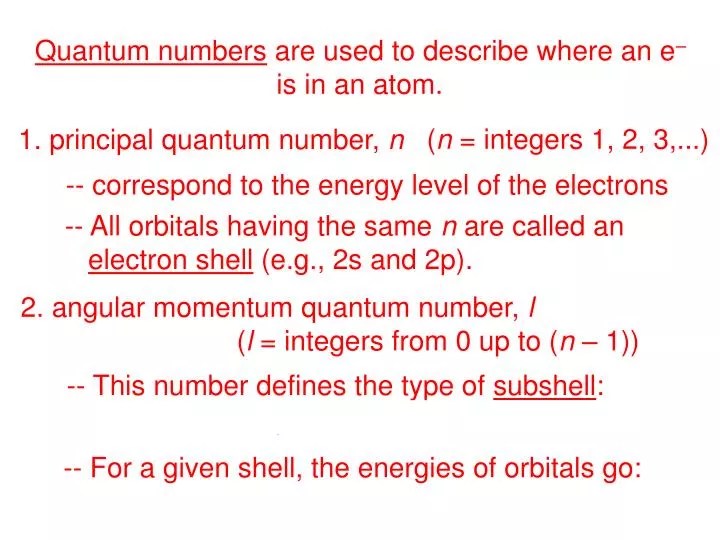 A set of four numbers through which we can get the complete information about all the electrons in an atom, be it energy, location, space, type of orbital occupied, and even the orientation of that orbital is called quantum numbers... Describes the shape of the orbital. N = 1, 2, 3, …, 8. The first quantum number describes the electron shell, or energy level, of an atom. • the state of an electron in an atom is defined by its four quantum numbers n, l, m, ms. Quantum numbers can be used to describe the quantum state of an electron. These numbers, as their name suggest, are heavily influenced by quantum mechanics, a branch of physics that deals with the movement and behavior of subatomic particles... Describes the shape of the orbital.